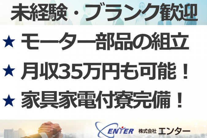 | 職種名 | モーター部品の組立スタッフ 未経験可 完全週休2日制 土日休み 体への負担なし 家電付き寮完備 |
