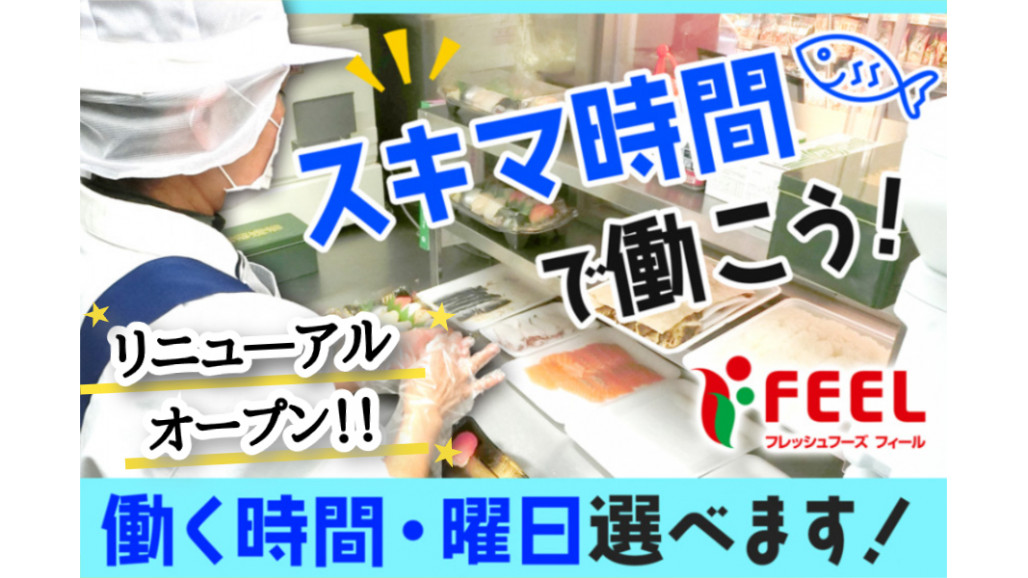 | 職種名 | 軽作業スタッフ 食品スーパーフィールでの寿司製造・陳列 リニューアルオープン 週2日~シフト制 フルタイム勤務可 社員食堂アリ |