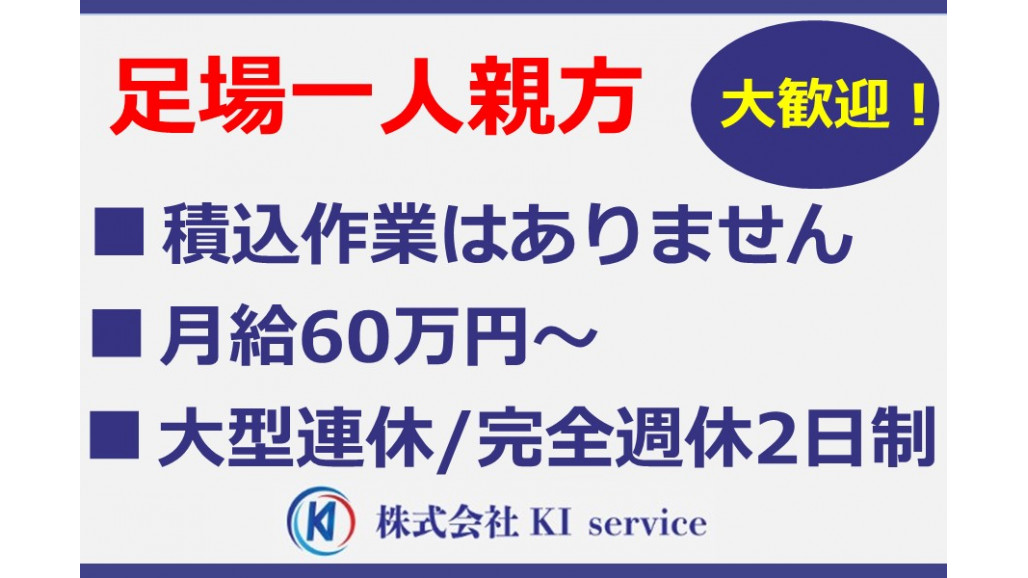 | 職種名 | 足場スタッフ 一人親方 完全週休2日制 働きやすさを追求 |