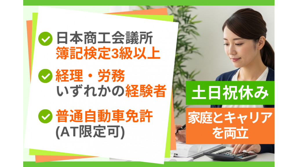 【必須条件】 日本商工会議所簿記検定3級以上 経理・労務いずれかの経験者 普通自動車免許(AT限定可) 短大卒以上 ※入社時期は年度明けから等調整可能です! |