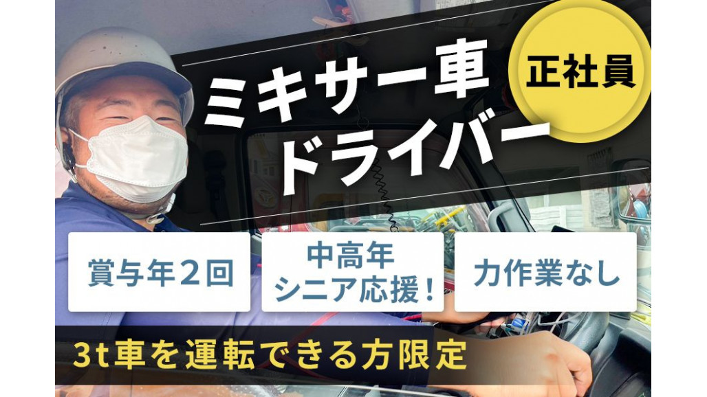 | 職種名 | 運搬会社の生コン車ドライバー 力仕事や長距離運転なし・残業少なめ・中高年シニア活躍 |