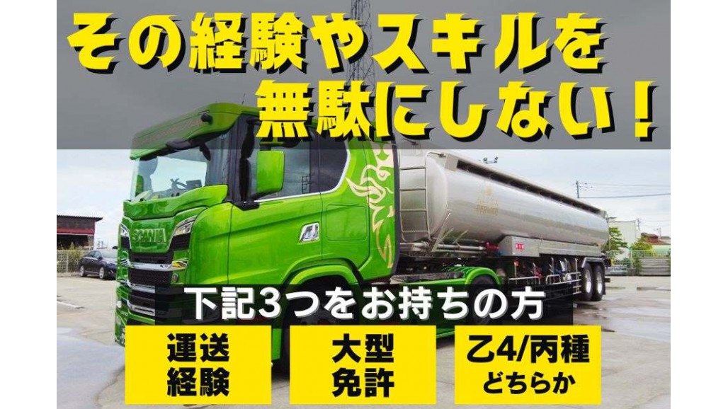 【必須】 運送ドライバー経験者の方(車両問わず) 大型自動車免許 危険物取扱者(乙4/丙種) 《あれば尚可》 けん引一種免許 ★ブランクOK/学歴不問 |