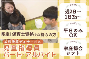 介護・福祉業界や学童保育で放課後等デイサービススタッフや児童発達支援に携わることができる職場です。放課後等デイサービススタッフ、児童指導員任用資格で働きたい方も活躍できます。放課後等デイサービススタッフや障がい児サポートスタッフに未経験から挑戦したい方。実務未経験OKで、主夫主婦、中高年層も活躍。土日祝休みOKやスキマ時間勤務OKの整った環境で放課後等デイサービススタッフのパート・アルバイトとして安定して働けます。現在、放課後等デイサービススタッフのパート・アルバイトを新着急募しています。週2日~勤務OKで扶養内勤務OKの児童発達支援事業所で放課後等デイサービススタッフのパート・アルバイトとして働ける求人です。
