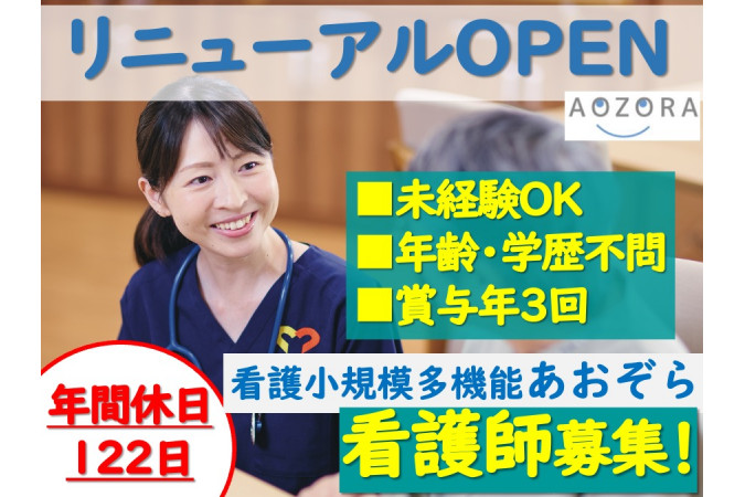 2026年8月に看護小規模多機能にリニューアルオープン! ■看護小規模多機能とは デイサービス・ショートステイ・訪問介護・訪問看護・居宅介護を一体で行う在宅サービスです。 ご利用者様の状態に合わせて関わり方を変えながら、顔なじみのチームで継続的に支援します。 ■具体的な仕事内容 ●通い・訪問の利用者様の看護業務 ・バイタルチェック、服薬管理 ・医療的ケア(胃ろう・点滴・褥瘡ケアなど) ・泊まりの利用者様のオンコール対応(夜勤はありません) ・介護スタッフとの連携、見守り など ※訪問・通い・泊まりと、1日単位で関わり方が変わるため、柔軟な対応力や総合的なケア力が身につきます。 ■未経験でも安心! 全国(複数拠点)に事業所を展開しているからこその、手厚い教育体制・本部からのサポート体制があります!ご自身に合わせたキャリアアップが可能です。 ■子育てしながらキャリアアップ 働きやすい環境のため子育てしながら、キャリアアップしていきたい方にもオススメです!!! グループ内では子育て世代の管理者さんもいます! ■青空グループについて ホームページは 「青空 介護 神奈川県」 で検索ください。 |