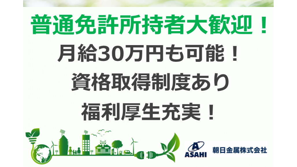 ■お客様からの依頼内容に合わせてトラックを手配するお仕事です■ ✅朝日金属株式会社について 創業60年以上、鉄や非鉄金属スクラップの回収・選別して、再生資源としてリサイクルをしている安定企業!現在、約130名のドライバーが活躍し、200台のトラックを保有しています。 環境保全への関心の高まりとともに、リサイクル事業の需要が拡大中。将来性のある職場で安心して長く取り組んでいけます! 【お仕事内容】 お客様から引き取り依頼を受け、ご要望に合わせて適切なトラックを手配したり、トラックの移動距離を計算しながらドライバーさんに業務を依頼したりするマネジメントのお仕事です。 現場作業やドライバーさんの移動が円滑に進むように、電話やパソコン、無線を使って、配車・連絡・調整などの運行管理業務をお任せします。 ================== 経験ゼロでも安心スタート! 充実の研修でスキルアップ! ================== まずは、現場にて1ヶ月程度、取り扱う商品等の知識を学び、徐々に仕事を覚えていただきます。 先輩社員がしっかりとフォロー・サポートしますので、未経験の方も安心してご応募ください。 若手社員も多く活躍しています!仕事をしていく中で日々新しい発見や学びがありますので、自己成長を感じながら働いていただけます。 ※長期キャリア形成のため、20代・30代の業界・業種未経験の方も積極的に採用しています! ※入社時期はご相談ください。 |