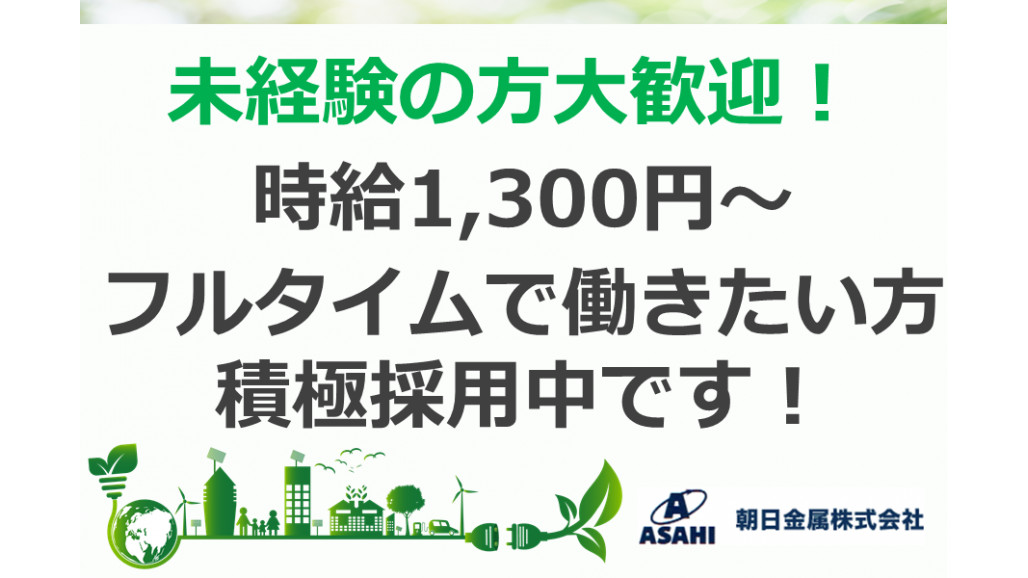 金属やプラスチックなど、いろんな素材を仕分け・解体してリサイクルする簡単なお仕事です! 【具体的なお仕事内容】 ・ラインでの選別作業 ・手ばらしによる解体作業 ・リサイクル品の仕分け作業 ・清掃作業 ✅未経験スタートの方がほとんどです! ✅丁寧にお教えしますのでご安心ください! ========== 当社について ========== 朝日金属は、創業60年以上、鉄や非鉄金属スクラップの回収・リサイクルを行う安定企業!現在、約130名のドライバーが活躍し、200台のトラックを保有しています。 環境保全への関心の高まりとともに、リサイクル事業の需要が拡大中。将来性のある職場で安心して長く取り組んでいけます! |