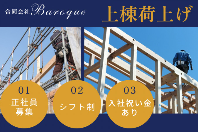 \入社祝い金30万円あり/ 上棟荷上げの正社員を大募集! 《仕事内容》 住宅の建築現場で建物の骨組みとなる柱や梁などの部材を組み立てるお仕事です。 《Baroqueのおすすめポイント》 ■経験者優遇 ■シフト制 ■昇給(随時)あり・賞与あり ■入社祝い金あり(上限30万円) ※前借りOK ■直行直帰OK!! \未経験応援/ 上棟荷上げとしての業務内容は経験がなくても大丈夫☆ 先輩スタッフが優しく丁寧に教えてくれる環境です! |