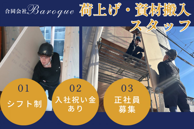 \入社祝い金30万円あり/ 荷上げ・資材搬入スタッフの正社員を大募集! 《仕事内容》 戸建て・アパート・マンション・ビルに建築資材の搬入を行うお仕事です。 (資材の搬入・搬出、資材の移動、設置作業、片付け作業) 《Baroqueのおすすめポイント》 ■経験者優遇 ■シフト制あり ■昇給(随時)あり・賞与あり ■入社祝い金あり(上限30万円) ■直行直帰OK!! \未経験応援/ 荷上げ・資材搬入スタッフとしての業務内容は経験がなくても大丈夫☆ 先輩スタッフが優しく丁寧に教えてくれる環境です! 少しでも資材搬入スタッフの仕事にご興味持たれましたら、ご応募ください☆ |