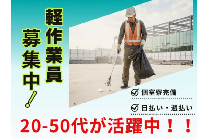 ✅️個室寮完備&3食付き⇒生活環境完備! ✅️保険料や税金は会社補助⇒手取り多め! 県外・遠方からの応募もしっかりサポート◎ \未経験から始める安心の現場ワーク!/ 建設・土木現場のゴミ片づけをお任せ。 ● 今すぐ稼ぎたい!働きたい! ● 地元を離れて新しく始めたい! ● 住み込みでがっつり稼ぎたい! そんな方が安心して始められる環境です! 保険料・税金は会社が負担するから、 実際の受け取り額は他より【3〜6万】も多い◎ 【お任せするのは下記の作業!】 ・現場内の清掃や片づけ ・タイヤ洗い、水まき ・ガレキや資材の運搬サポート など 特別な経験や資格は不要! 「体ひとつ」ですぐ稼ぎたい方にオススメ! |