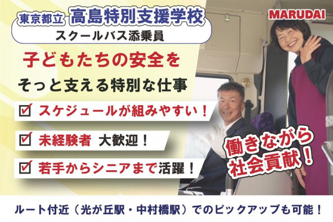 ■仕事内容 特別支援学校の通学バスサポートスタッフとして、生徒様をバス送迎補助していただきます! \4月運行開始に向けて、3月から準備スタート!/ ・【3月入社】まずは座学&先輩のコースでじっくり研修 ・3月に入社される方が多く、同じタイミングで始める「同期」がたくさんいる ・4月には全社研修もあり、他のエリアのスタッフとも関われる \特別支援学校の通学バスサポートスタッフの働きやすさ/ ◇スケジュールが決まっている◇ 送迎スケジュールはもちろん、学校の予定に合わせてお休みも決まっています! ◇毎日同じルートで運行◇ 観光バスのような異なるルートはありません!一度覚えてしまえば楽々です! \現在募集中のルートはこちら/ ・高島特別支援学校 住所:東京都板橋区高島平3丁目7−2 お近くにお住まいの方は、運行ルート付近(光が丘駅・中村橋駅付近)でのピックアップも可能です。 ■1日の流れ(例) (登校便) 7:00 各バス停を周り、生徒様を順番にお迎えします。 ↓ 9:00 学校に到着。生徒様を先生に引き渡します。 (下校便) 14:00 学校に到着。生徒様をお乗せし、各バス停を周ります。 ↓ 16:00 生徒様を全員送り届けたら送迎は終了です。営業所に帰庫します。 \スクールバスならではの休憩時間の使い方/ ◇休憩は5時間!使い方は自由!◇ ・ご自宅に帰って家事や趣味の時間に充てる ・平日昼でも役所や病院/歯医者へ ・布団を持ち込んでお昼寝 ・近くのスポーツジムでトレーニング ・Wワークで副業も自由 ■活かせる資格・経験 経験は一切問いません!どなたでも未経験からスタートできるお仕事です! 【福祉/保育に関わるお仕事の経験がある】 【福祉/保育系資格を持っているけれど今は活かせていない】 という方も大歓迎です! また生徒さんとの関わり方は学校と保護者の方が特性に合わせて決定します。 一人一人に向き合ってお仕事をしたいという方におすすめです! ■こんな方におすすめ ◇年齢を気にせず働きたい方◇ ・若年層から中高年シニアの幅広い世代が活躍中! ◇時間を確保したい方◇ ・決まったスケジュールで、家庭との両立をしやすい! ・夏休みや冬休みなど、お子様の休みに合わせた休暇をとれる! ◇好きなことに関わりたい方◇ ・生徒さんや親御さんの笑顔/成長を見届けられる! ・元保育士で子どもが好き、元看護士で誰かの力になりたいなあなたに! ◇地元が好きな方◇ ・転勤なく、地元で働き続けることができる! ・決まった近隣エリアのみの運行で、地域に密着! ■入社後の流れ <1日目> まずは座学や動画マニュアルで、業務内容をじっくりと理解していただきます。 ※状況に応じて、午後の下校便に実際に同乗し、業務を見学いただく場合もあります。 <2日目~6日目> 専任の指導員がサポートしますので、実際に業務をこなしながら、仕事に慣れていただきます。 <7日目以降~> 正式に、現場での業務をお任せします。 ■働きやすい環境づくり ◇賞与は年2回支給◇ ◇転勤なし◇ 転居を伴う(県をまたぐ)異動は一切ありません!入社時に希望の拠点をお伝えください。 ■安全への取り組み 命を預かる事業者として安全性の向上へ日々取り組んでおります! ◇最新設備の導入◇ 最新の安全技術、PCS、VSC装備車両を随時導入して 走行状態を検知して危険を抑止しています。 ◇健康チェック◇ ドライバーの睡眠時無呼吸症候群の可能性を事前にチェックして 安全運行に役立てています! =================== 創業102年 ~大正生まれの実績と伝統ある企業です~ 長い歴史と伝統がある当社ですが、新しい風も常に取り入れています! 安全への取り組みも積極的! 風通しの良い職場なので ぜひあなたの意見などもどんどん聞かせてください。 一緒に「より良い会社」にしていきましょう! =================== \まずはお気軽にご応募ください/ ご経験の活かし方や、ライフスタイルに合わせた働き方などまずはご相談ください! 少しでも気になったら、ご応募をお待ちしております! ★リファラル採用実施中★ 知人や友人を紹介し、採用が決定すると、 紹介者に10,000円、入社者にも10,000円を支給します! |