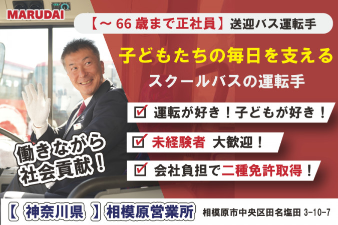 ■仕事内容 スクールバスの運転手として、生徒さんを送迎していただきます! \スクールバス運転手の働きやすさ/ ◇毎日同じルートで運行◇ 観光バスのような異なるルートはありません!一度覚えてしまえば楽々です! ◇スケジュールが決まっている◇ 送迎スケジュールはもちろん、学校の予定に合わせてお休みも決まっています! ◇添乗員さんと協力◇ 運転手さんだけでなく、添乗員さんが同乗するので協力して生徒をフォローできます! ◇近距離運転中心◇ 長距離の運転・高速道路の運転は少なく、近隣地域の運行のため、疲労も残りにくいです! ◇若手からシニアまで長く活躍◇ 定年は66歳のため、正社員として長く活躍!67歳以降も契約社員としてさらに長く働けます! ■1日の流れ(例) (登校便) 5:30 営業所に出勤し、点呼や運行前車両点検を行います。 ↓ 6:00 各コースに向け、営業所から出庫します。 ↓ 7:00 各バス停を周り、生徒様を順番にお迎えします。 ↓ 9:00 学校に到着。生徒様を先生に引き渡します。 ↓ 9:30 営業所or待機所に到着。午後便が始まるまでは自由な休憩時間です。 (下校便) 13:30 休憩も終わり下校便のスタートです。生徒様をお迎えに学校に向かいます。 ↓ 14:00 学校に到着。生徒様をお乗せし、各バス停を周ります。 ↓ 16:00 生徒様を全員送り届けたら送迎は終了です。営業所に帰庫します。 ↓ 17:30 営業所に到着しました。車両の清掃や点呼を済ませ、一日の業務が終了となります。 \スクールバスならではの休憩時間の使い方/ ◇休憩は5時間!使い方は自由!◇ ・ご自宅に帰って家事や趣味の時間に充てる ・平日昼でも役所や病院/歯医者へ ・布団を持ち込んでお昼寝 ・近くのスポーツジムでトレーニング ・Wワークで副業も可能 ■活かせる資格・経験 ◇大型二種免許◇ 送迎バス運転の経験はなくても、資格があればすぐに活躍することができます! ◇活かせる経験◇ ・スクールバス運転手 ・幼稚園バス運転手 ・路線バス運転手 ・送迎ドライバー ・バスドライバー ・タクシー運転手 ・配送ドライバー ・トラックドライバー ・病院/施設の送迎ドライバー ・スイミングバス運転手 ・教習所教官 ※大型二種免許をお持ちでない場合も、入社後に取得可能! ■こんな方におすすめ ◇年齢・経験を気にせず働きたい方◇ ・若年層から中高年シニアの幅広い世代が活躍中! ・長距離運転や深夜運転がなく、疲労がたまりにくい! ◇時間を確保したい方◇ ・決まったスケジュールで、家庭との両立をしやすい! ・夏休みや冬休みなど、お子様の休みに合わせた休暇をとれる! ◇好きなことに関わりたい方◇ ・生徒さんや親御さんの笑顔/成長を見届けられる! ・車に関わり続けることができる! ◇地元が好きな方◇ ・転勤なく、地元で働き続けることができる! ・決まった近隣エリアのみの運転で、地域に密着! ■先輩社員の入社経緯 ◇トラックドライバーから転職◇ 長距離トラックのドライバーとして働いていましたが、深夜の勤務など労働時間が体力的に難しく転職を考えていました。 今の仕事は、毎日決まった時間の日中業務になるので、とても安定して働くことができています。 ◇病院の送迎ドライバーから転職◇ 人と関わる運転がしたく、病院で送迎バスのドライバーをしていましたが、キャリアアップのために転職を検討していました。 大型自動車二種免許は持っていませんでしたが、入社後の資格取得制度で、取得が可能だと知り、入社を決めました。 ◇定年後も見据えた転職◇ 50代後半になり、60代でも続けられる仕事を探していました。丸大観光のバスドライバーは定年が66歳なので、 正社員として働ける期間も長く、定年後も再雇用で契約社員として働いている先輩も多いという点が決め手になりました。 ■現場に出るまでの流れ <大型二種免許をお持ちの場合> ①座学研修(10時間) ②実車研修(20時間~) ③先任者同行のもと担当コースを試運行(4~8回) ※2~4週間を目処に運行スタートが可能です。 <大型二種免許をお持ちでない場合> 入社後に当社全額支援で大型自動車二種免許を取得いただきます。 (提携教習所で通学・合宿を選択可能) ※取得後の流れは既にお持ちの場合と同様です。 ■働きやすい環境づくり ◇賞与は年2回支給◇ ◇転勤なし◇ 転居を伴う(県をまたぐ)異動は一切ありません!入社時に希望の拠点をお伝えください。 ■安全への取り組み 命を預かる事業者として安全性の向上へ日々取り組んでおります! ◇最新設備の導入◇ 最新の安全技術、PCS、VSC装備車両を随時導入して 走行状態を検知して危険を抑止しています。 ◇健康チェック◇ ドライバーの睡眠時無呼吸症候群の可能性を事前にチェックして 安全運行に役立てています! =================== 創業101年 ~大正生まれの実績と伝統ある企業です~ 長い歴史と伝統がある当社ですが、新しい風も常に取り入れています! 安全への取り組みも積極的! 風通しの良い職場なので ぜひあなたの意見などもどんどん聞かせてください。 一緒に「よ