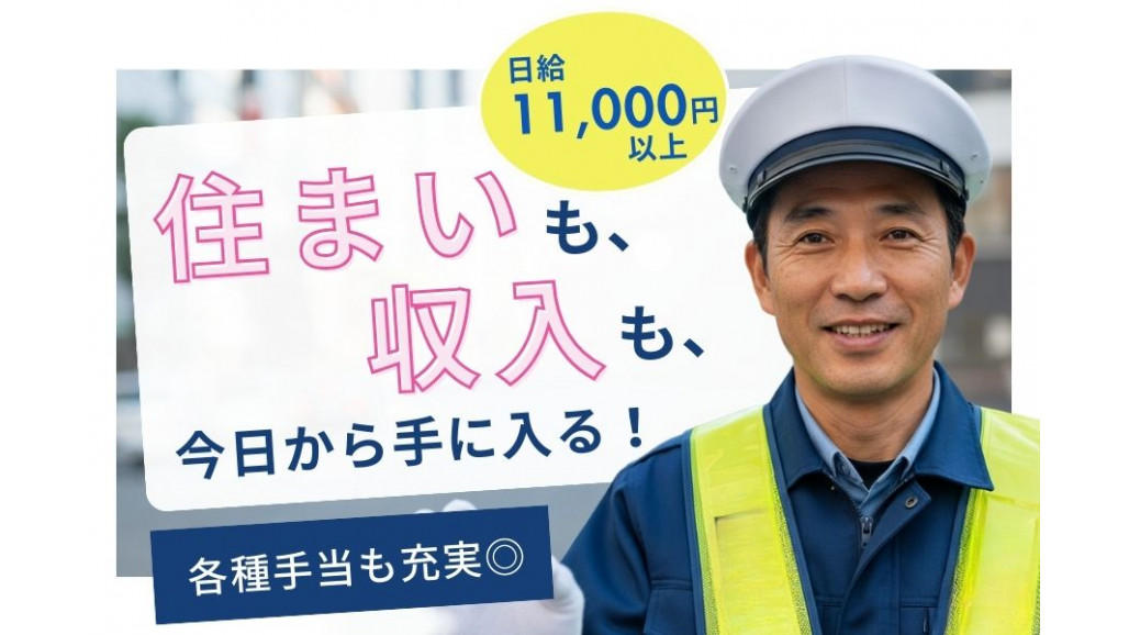 | 職種名 | 街の安全を守るお仕事 土木工事や公共機関の周辺での交通誘導 日勤 1日11,000円~ 土日祝休み 週1~可 寮・社宅完備 |