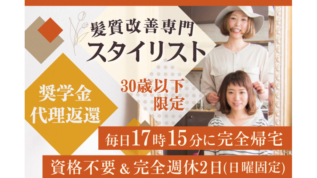 | 職種名 | 髪質改善サロンのアシスタントスタイリスト・資格取得支援 土日祝休み可 |