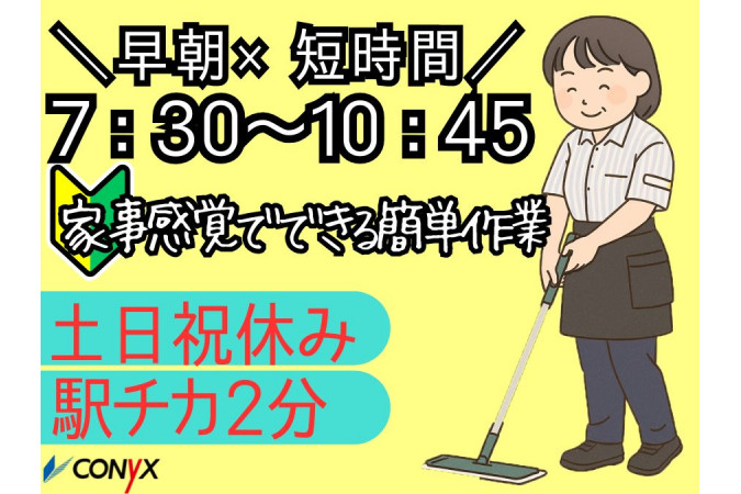 | 職種名 | テナントビルの清掃 7:30~10:45 土日祝休み 週5日 |