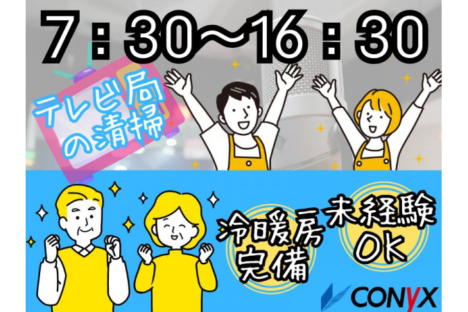 | 職種名 | テレビ局内の日常清掃 7:30~16:30 休憩120分 平日週5日 祝日休 |
