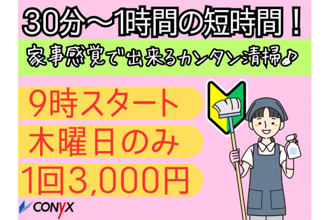 | 職種名 | オフィスと寮の共用部清掃 木曜のみ 9時~ 30分~1時間程度の短時間 |