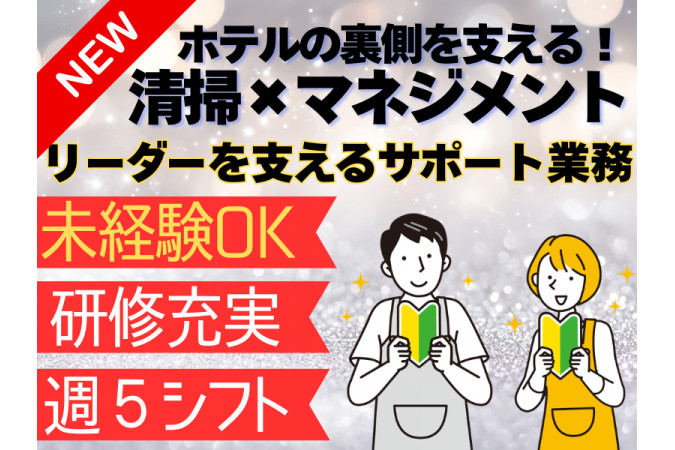 チームを支える“縁の下の力持ち”として活躍! 清掃を管理するリーダーをサポートするサブリーダーの募集です! ✅客室準備チェッカー ✅ベッドメイク ✅客室清掃 など実務作業に加え、 ✅ホテルとの連絡共有 ✅清掃業務の管理 ✅スタッフ育成・勤怠管理 ✅在庫管理 など、 リーダーが担っている、 お仕事のサポートや代務をお願いします。 ▶マネジメント業務経験はあるが、清掃は未経験 →問題なし!スタッフによる丁寧な研修で業務の基本からコツまでしっかり伝えていきます。 ▶清掃の経験はあるが、打合せや管理は未経験 →まず清掃経験者は即戦力です!確実にスキルを身に着けていけるよう、スタッフがサポート致します。 ▶もちろんどちらも未経験でも大歓迎! →未経験・異業種チャレンジでも実務経験で確実にスキルを身に着けていける環境です! 【このような方にオススメです!】 ・身体を動かす仕事が好きな方 ・チームで動くことが好きな方 ・人と関わることが好きな方 ・週休2日!平日休みがほしい方 ・転勤なし!安定して働きたい方 【求人ID-ALL11A】 |