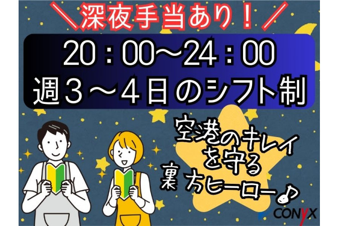 | 職種名 | 中部国際空港(セントレア)の夜間清掃 土日祝も勤務できる方 20:00~24:00 週3~4日 |