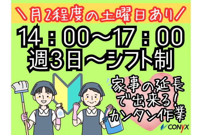 【勤務時間】 14:00~17:00(休憩なし、実働3.0時間) 【勤務日】 週3日~シフト制 |