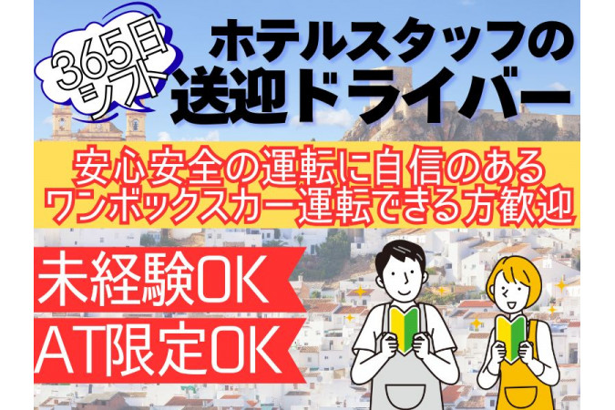 ▶AT限定OK! ▶スタッフのみ!お客様対応なし! 7~8人乗りの社用ワンボックスカーでの送迎ドライバー募集中! 【具体的なお仕事内容】 ✅ホテルの清掃スタッフ・共用部スタッフ達の各ポジションで働くスタッフの送迎 ✅清掃スケジュールリストに沿って送迎 ✅カンタンな雑務(待ち時間が長い場合のみ) 【1日の流れ】 〇 9:00頃 往復 〇12:00前後 往復 〇15:00前後 往復 〇16:30前後 往復 ホテル⇔清掃スタッフの各時間ごとの送迎業務となります。 \未経験OK/ 担当スタッフのフォロー体制あり! 送迎が初めての方でもOK! 慣れるまで丁寧にサポートします。 【求人ID-ALL11A】 |