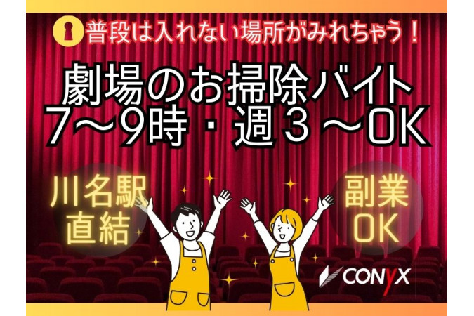 | 職種名 | 劇場の清掃 火~日のうち、週3日~可 朝7:00~9:00 シフト制 |