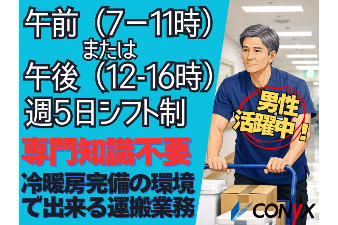 【今だけ!2026年4月~6月末まで時給100円UP】 【お仕事内容】 病院内でのシンプルな搬送サポート業務をお願いします。 ■具体的なお仕事 ✅院内の各部署へ書類や検体の回収・お届け ✅診療に必要な備品や消耗品の補充・運搬 ✅台車を使用した物品の移動作業 など あらかじめ決まったルートを回るお仕事なので、 複雑な作業はなく、未経験の方でもすぐに慣れていただけます。 時間にゆとりのあるルート設計のため、落ち着いて作業を進められる環境です。 ▶働きやすいポイント ・午前のみ/午後のみの短時間勤務OK ・ルートが決まっているので覚えやすい ・随時休憩ありで負担少なめ ・複数名での分担制で安心 ・空調の効いた院内で快適に働けます ・コツコツ進めるシンプル作業 ・研修あり!慣れるまでしっかりフォロー ※台車での運搬が中心ですが、一部重量物の取り扱いがあります ===================== 充実したサポートが自慢です ===================== 創業70年以上のコニックスだからこそ、 働くスタッフへのフォロー体制は抜群です! ⭐覚えられるまで丁寧にしっかりとサポート! ⭐必要時には担当スタッフがすぐにフォロー! ⭐お休みも取りやすい環境です! 【求人ID-MDR02A】 |