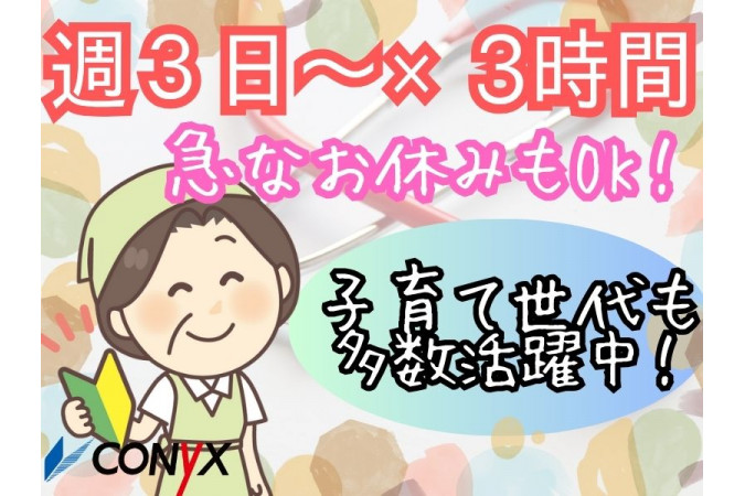 【勤務時間】 9:00~12:00(休憩なし、実働3.0時間) 【勤務日】 週3日~(シフト制) ※勤務日数・曜日につきましては、お気軽にご相談ください。 |
