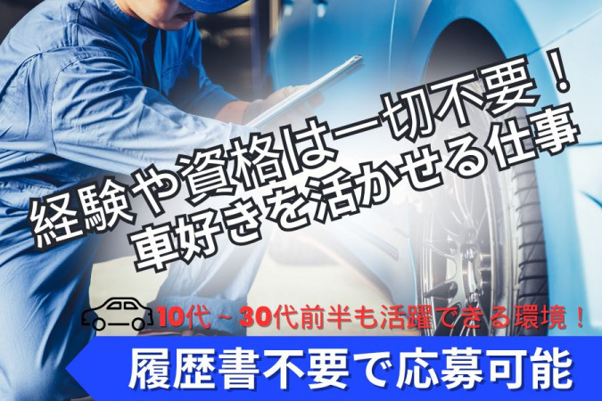 | 職種名 | 車好き必見"好き"を活かせるピットSTAFF 水曜日定休 平均年齢34歳 社会人未経験可 履歴書なしで応募可 社員割引あり |