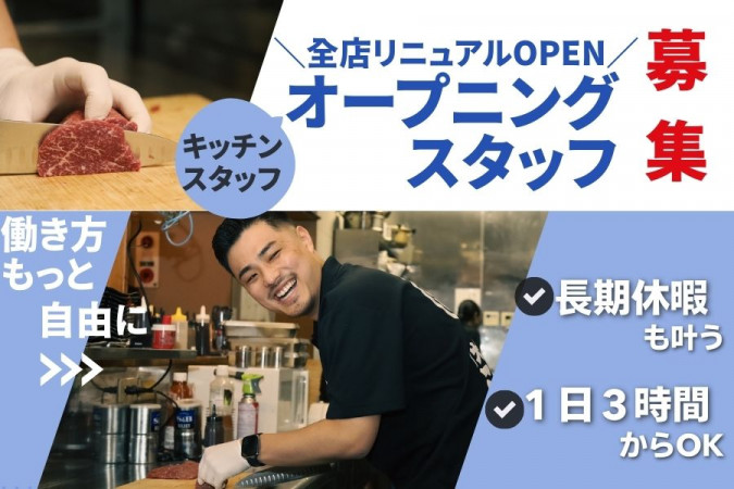 | 職種名 | リニューアルオープンの焼肉店キッチンスタッフ 未経験可 まかないあり 1日3時間~ 交通費一部支給 オシャレ自由 |