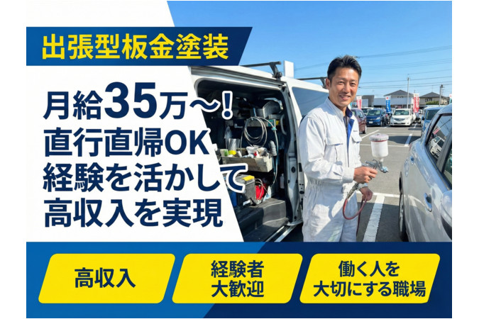 \\家賃・光熱費込み月1万円の寮完備◎//  ̄ ̄ ̄ ̄ ̄ ̄ ̄ ̄ ̄ ̄ ̄ ̄ ̄ ̄ ̄ ̄ ̄ 安定案件×インセンティブで“ がっつり稼げる”環境です❗️  ̄ ̄ ̄ ̄ ̄ ̄ ̄ ̄V ̄ ̄ ̄ ̄ ̄ ̄ ̄ ̄ ☑️月給35万〜45万円スタート! ☑️大手ディーラー案件中心で安定 ☑️社有車・機材一式貸与で業務に専念 ☑️これまでの経験を活かせる環境! \ 頑張りがしっかり還元される制度も / □賞与年2回+決算賞与あり! □成果に応じたインセンティブあり 【仕事内容】 出張板金塗装スタッフのお仕事 ◆お仕事詳細 車の板金・塗装修理を担当 キズや凹みなど限定範囲の修理が中心 (大掛かりなフレーム修正などはなし) ◆作業場所 大手国産ディーラー店舗へ訪問 ※社有車で自宅から直接OK ※作業終了後は会社に報告し、直帰◎ 入社後は1〜2週間の研修で 仕事内容の流れ・工程を確認後、 すぐに独り立ち可能です! 【【安心してスタートできる環境】】 ⭕️機材・制服・ETC/ガソリンカード支給 └ 初期費用ゼロで始めることができる ⭕️社有車はナビ&ETC付き └ 直行直帰OKなので効率よく働ける ⭕️1~2週間の研修で独り立ち可能 └経験を活かしながらすぐ即戦力に |