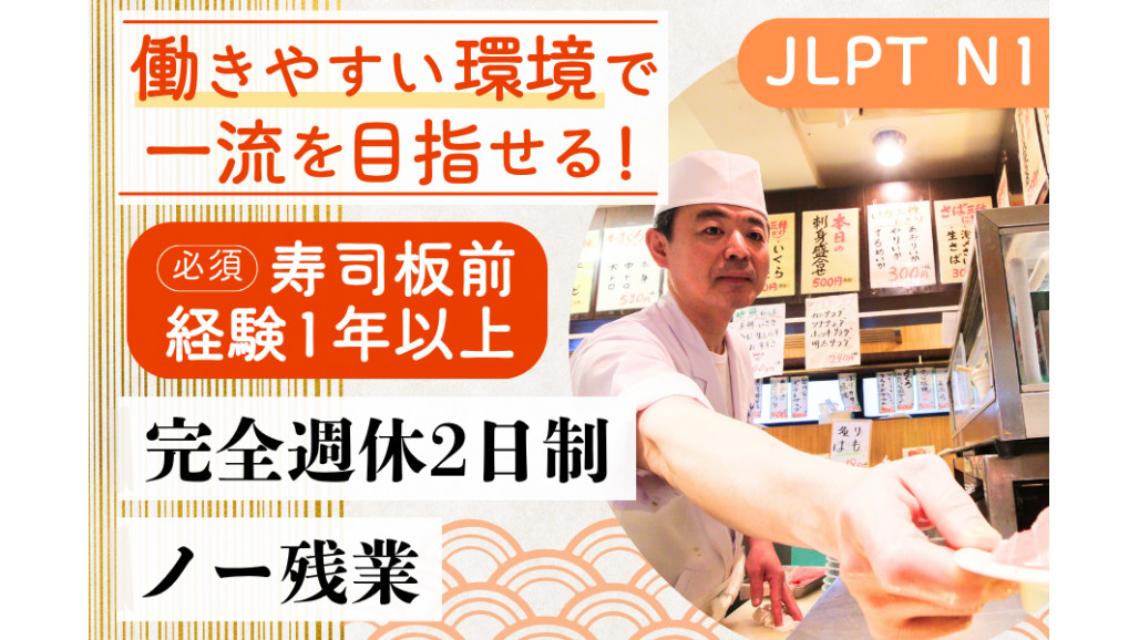 | 職種名 | 寿司スタッフ 寿司板前経験1年以上 完全週休2日制 残業なし |