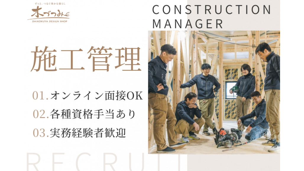 ●建築業界での施工管理の実務経験を2年以上お持ちの方 ※木造住宅の施工管理経験がある方は、即戦力として優遇いたします。 ●当社のスタンスに共感いただける方 ●人として「気持ちの良い挨拶ができる」「素直さと謙虚さを持っている」方を歓迎します。 ●周囲との円滑なコミュニケーションを大切にできる方 ●職人さんやお客様への感謝の気持ちを忘れず、チームで協力して物事を進められる方。 |