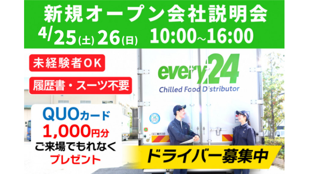 5月13日、岡山県に新たな拠点がオープン!一緒に新センターを盛り上げてくださる仲間を募集しています。 ✨オシャレな新センターで働けるチャンス!✨ 新しい物流センターだから、キレイで快適な環境でスタートできます。 休憩室にはカフェエリアも完備! 配送の合間も、居心地の良い環境でリフレッシュできます。 ✅エブリー24で働くポイント ・平均勤続8年以上の社員多数 ・賞与年2回+昇給あり ・成長を続ける物流業界 ・免許取得は自己負担ゼロ ・年間休日119日、希望休相談OK ✅仕事内容 センター間のルート配送をお願いします。 ・中型トラック(4t)で物流センターへ食品配送 ============== 安定した仕事をお探しの方へ ============== 安定企業「エブリー24」の配送ドライバーとして活躍しませんか? 40年以上、チルド食品の配送を支えてきた私たちは、未経験からのドライバーデビューを応援しています! 当社の強みは、長くお付き合いしているお客様が多いこと。安定した仕事ができる環境だから、安心して長く働けます。 ■経済が不安定なときも業績安定! ■約7割のお客様が5年以上のお付き合い ■今後ますます需要が増える物流業界 安定した収入と将来の安心を手にしたい方にピッタリの環境です。ドライバーとして、新しいスタートを切ってみませんか! ■■■説明会を開催します!■■■ 「とりあえず話だけ……」もOK! 少人数制のカジュアルな説明会なので、お気軽にご参加ください。 【開催日程(予定)】 4月25日(土) 10:00~16:00 4月26日(日) 10:00~16:00 ※所要時間:1回あたり約30分の少人数で実施します。 【開催場所】 【会場名】岡山新センター 【住所】岡山県岡山市南区箕島 付近 【説明会のポイント】 ▼参加のハードルはゼロ! 面接ではないので、履歴書もスーツも必要ありません。空いた時間にさくっと参加OK!リラックスしてお越しください。 ▼説明会の内容 仕事内容や職場の雰囲気をざっくばらんにご紹介します。質問や相談もお気軽にどうぞ! ▼参加特典あり! ご参加の方全員に「クオカード1,000円分」をプレゼント! 【求人ID-OKDY】 |