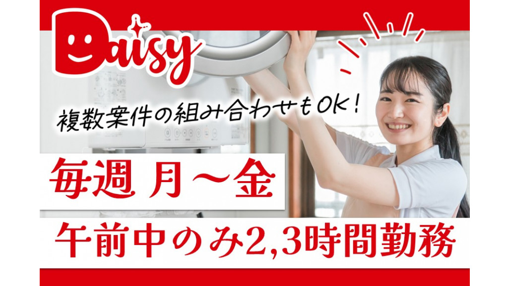 藤が丘駅から徒歩10分、車通勤もOKのお掃除代行のお仕事です! 週5日午前中の勤務です! 週2、3回のみでも大丈夫です◎ 月9:00~12:00 火9:00~11:00 水9:00~11:30 木9:00~11:30 金9:00~12:00 名東区のファミリー宅で、お掃除代行のお仕事です♪ 前任のスタッフさんがご家庭の事情で退職のため、引き継いで下さるスタッフさんを大募集です! 掃除機がけや窓拭き・お風呂やキッチンのお掃除など、一般的なお掃除なので、未経験でもスグに慣れることができます。 作業内容は丁寧に引継ぎますのでご安心ください♪ ⭐デイジーのお掃除代行スタッフ⭐ スマホ面接受付中! 主婦のお仕事として人気急上昇中! 1件2~3時間、時間単位でお仕事や育児にお忙しいお客様に代わって、日常のお掃除をはじめ、お洗濯・お料理などの家事を代行するお仕事です。 直行直帰なので、通いやすいエリアで勤務が可能!車通勤希望、家から〇分以内、お掃除案件のみOK,などご希望を出していただきます。 お掃除道具は基本的にお客様のお宅のものをお借りするので、電車通勤でもラクラク! ほとんどの方が未経験でスタートしますが、日常的な家事なので、皆さんすぐに慣れて長く働いて頂いています。 主婦経験を活かしてお小遣い稼ぎ、そしていつもの家事でありがとうがもらえる、とってもやりがいのあるお仕事です! ⭐一般的なお仕事内容⭐ ~お掃除編~ お客様のお宅の掃除道具をお借りして、ホコリ取りや掃除機がけ、水回り(キッチン・お風呂・トイレなど)のお掃除や整理整頓などを行います。研修でキレイに見えるコツをお伝えします! ~お料理編~ 食材やお料理のお好み、何人分か、ご家族構成など事前にヒアリング。お買い物・お料理・後片付けなどを行います。ご提供するのは一般的な家庭料理です。お口に合うかな?と不安かもしれませんが、大丈夫。定期的にお伺いするお宅が多いので、味付けや量のお好みなど、少しずつすり合わせしていってもらえればOKです。 ~お洗濯編~ 洗濯機をかけたり、洗濯物を干したり、取り込んで畳んだり、アイロンをかけたり。一般的なおうちでのお洗濯を行います。 ⭐このお仕事のPOINT⭐ ✅POINT① 短時間・高時給で効率よくお仕事できる 案件は1件2~3時間が多いので、少しだけ働きたい、という方にもピッタリ! 時間制のサービスなので思わぬ残業が発生、ということもありません。 地域最高時給のデイジーなら、短い時間でも効率よくお小遣い稼ぎ! たくさん働きたい方は1日2件・3件掛け持ちも可能です。 ✅POINT② 家庭と両立しやすい シングルマザーの方、久しぶりのお仕事の方、子育てママさん、ダブルワークの方も多数活躍中! 女性が活躍する社会をつくりたい、という想いで創られた会社だから、働く女性の気持ちにもしっかり寄り添います。 お子さんの急な熱やご家庭の事情で急にお休みしなければいけない時もしっかりフォローするので安心してくださいね。 長く安心してお仕事できる環境です。 ✅POINT③ 教育プログラムと手厚いフォローで未経験でも安心 デイジーは、ただ紹介するだけ、の家事代行会社ではありません。 座学研修→研修施設での実地研修→担当案件への同行・個別アドバイスとゼロから丁寧に教えます。 ✅POINT④ 経験者も大満足 「他社に登録しているけどお仕事が全然紹介してもらえない」 「自己流でやってるけど喜んで頂けるサービスができているのか不安」 「本部がほったらかしで不満」 「自分で確定申告しなければいけなくて面倒」 という経験者の方もデイジーなら安心してお仕事できます。 ✅POINT⑤ キャリアアップ可能 整理収納コーディネーターなど関連資格の取得支援制度あり。 もっとステップアップしたい!という方には研修指導員などステップアップも可能です。 社員登用制度もあるのでまずはパートで働いてスキルを磨いて子供が大きくなったら正社員・リーダーを目指す、ということも可能です! ちょっと話を聞いてみたい、という方もまずはお気軽にご連絡くださいね! もっと詳しいお仕事内容やQ&Aを応募ボタンの下でご案内しています。 そちらもぜひご覧ください。 【求人ID-MR】 |