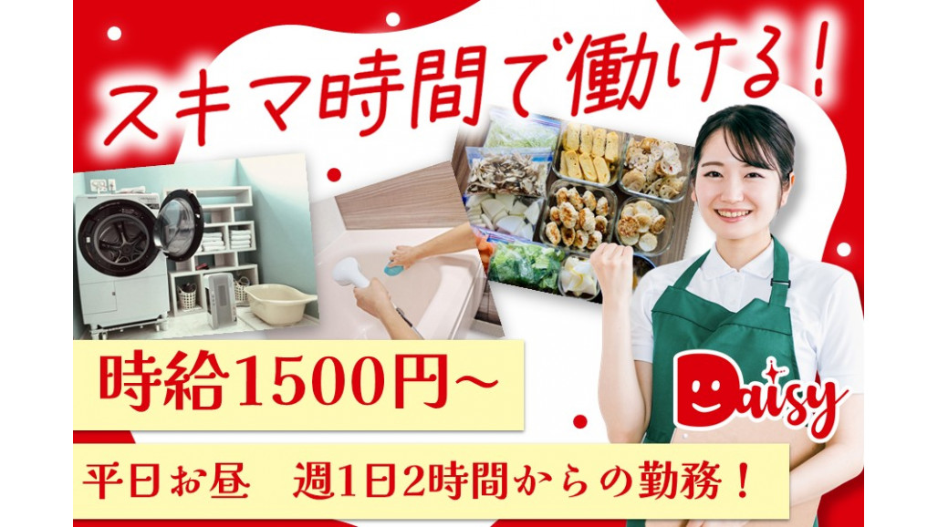 ■時給1,500円~ ■週1回、1日2時間~OK ■フォロー体制万全 ■案件豊富で希望に合わせて働ける! ■平日昼間勤務で主婦活躍中! 個人宅での家事代行スタッフ大募集! デイジーは、定期契約のお客様が多いのでお仕事も安定していて安心です。 他社でのご経験ある方は優遇します。 ・主婦(夫)パート・アルバイトとして人気急上昇中! 1件2~3時間、個人宅でお掃除・お洗濯・お料理などの家事を代行するお仕事です。 サービスに必要な道具は基本的にお客様のお宅のものをお借りするので、電車通勤でもラクラク! ほとんどの方が未経験でスタートしますが、日常的な家事なので、皆さんすぐに慣れて長く働いて頂いています。 ■■■■このお仕事のPOINT■■■■ ■主婦多数活躍中 ご自分に合った働き方が可能です お客様1件につき、所要時間は2~3時間! お掃除だけがいい、お料理希望など、ご希望に合った案件をご紹介します! ■地域密着30年・名古屋エリアに案件多数! 直行直帰で通いやすいエリアを選べます! 近くがいいけど学区内はいや、車通勤したい、家から〇分以内、など何でもご相談ください! ■教育プログラムと手厚いフォローで未経験でも安心 はじめに丁寧な座学と実地の研修を行います 最初は担当コーディネーターが同行してフォローします! ■他社で勤務・登録中の方もご相談ください! WワークもOKです ■資格取得支援・社員登用あり! ご自分の生活に役立つ資格取得も目指せます! 主婦(夫)経験を活かしてお小遣い稼ぎ、そしていつもの家事でありがとうがもらえる、とってもやりがいのあるお仕事です! 【求人ID-NM】 |