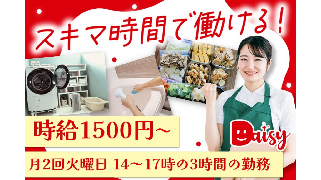 東京都板橋区の個人宅にて、家事代行スタッフさんを大募集します! 【具体的なお仕事内容】 個人宅(マンション)のお掃除をお願いします。 ・マンションのゴミステーションへごみ出し ・コインランドリーへお洋服を持っていく(乾燥のみ) ↓ ・その間に水回り掃除 ↓ ・コインランドリーのお洋服を回収→畳んで収納 ・床拭き ■時給1,500円~ ■月2回火曜日14~17時の3時間 ■フォロー体制万全 ■家事スキルが活かせる ■案件豊富で希望に合わせて働ける! ----------------------------------- 希望に合わせた働き方が可能です ----------------------------------- 週1回、1日2時間から勤務OKです。他の訪問先との掛け持ちなどもできるので、お気軽にご相談くださいね。 「扶養控除内で週5日働きたい」「曜日により働く量を調整したい」「最初は週1回からスタートして、慣れてきたら増やしていきたい」など、ご自身に合った働き方ができますよ。 ------------------------------------ お客様とのやりとりは本部が対応 ------------------------------------ 直接雇用のお仕事のため、万が一トラブルが起きた際もすべて本部が対応します。確定申告も本部が行うため、複雑な事務処理などで困ることもありません。 また、入社時に座学研修やマンツーマンでの実地研修、サービス同行など、しっかりしたサポート体制が整っているので未経験の方やブランクのある方も安心してスタートできます。 安心してお仕事に取り組んでいただけるように、サポート体制を整えています! 【デイジーの家事代行サービス】 個人宅にて、お忙しいお客様に代わって日常の家事を代行します。 慣れ親しんだ家事ばかりなので久しぶりのお仕事の方でも安心です! お仕事によって、お掃除だけ、お料理中心、など色々あるのでお気軽にご相談ください。 「もう少し詳しくお話を聞いてみたい」というお問合せでももちろん大歓迎です! ぜひお気軽にご連絡くださいね。 【求人ID-TKO】 |