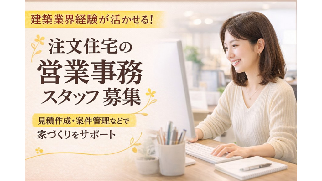 当社は、インテリアから建築までトータルで提案する住宅専門企業です。 注文住宅ブランド「OWN RESORT HOME」の家づくりを支える 営業事務スタッフを募集します。 営業・設計・工務と連携しながら、 見積作成や案件管理などを通して スムーズな家づくりを社内からサポートするポジションです。 【主な業務内容】 ・見積書の作成 ・建築図面をもとにした数量確認 ・協力会社への見積依頼、内容確認 ・営業・設計・工務との社内調整 ・発注会議資料の作成 ・案件進行のサポート業務 建築業界での経験や見積作成経験を活かしながら、 社内の中心メンバーとして家づくりに関わることができます。 【1日のスケジュール例】 09:00~09:30 メール・LINE対応 09:30~12:00 見積依頼、業者手配 12:00~13:00 休憩 13:00~15:30 発注会議資料作成 15:30~16:00 工務部ミーティング 16:00~18:00 発注会議・案件管理 【職場環境】 30~40代のスタッフが中心で、 営業・設計・工務など部署間の連携もスムーズです。 フレンドリーで相談しやすい雰囲気の職場で、 経験を活かしながら安定して働くことができます。 【求人ID-SEK】 |