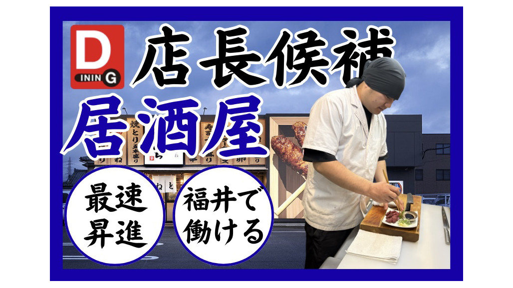人気居酒屋にて新店オープニングをみすえて、店長候補(正社員)大募集中! ───────────────────────── ■ ダイニングの働きやすい魅力7選 ───────────────────────── ① 飲食店経験者活躍!過去の調理経験をしっかり活かせる環境 ② 実際に “独立したスタッフ” も在籍。経験を積んで自分のお店を持つチャンスがあります。 ③ 明確なキャリアステップ制度で、成長が見える・進める ④ 「ありがとう」が直接届く、やりがいのある接客・調理の仕事 ⑤ 居酒屋・イタリアン・焼肉…、複数の業態に挑戦が可能! ⑥ 富山・福井に地域密着!北陸で長く働ける。 ⑦ 福井駅から徒歩3分。ラクラク通勤で通いやすい ───────────────────────── ■ ダイニングの働きやすい魅力について ───────────────────────── ◆ 飲食店経験者活躍!過去の調理経験をしっかり活かせる環境 ダイニングは過去の飲食経験が活かせる環境です。 実際に、飲食経験を活かして入社6ヶ月で店長になったスタッフもいます。 ◆ 居酒屋・イタリアン・焼肉…、複数の業態に挑戦が可能! 居酒屋だけでなく、イタリアンや焼肉など複数の業態を展開しています。 さまざまなジャンルの調理経験を積むことができ、成長する事ができる環境です。 ◆ 明確なキャリアステップ制度!あなたの成長を応援しています。 明確なキャリアステップを用意しており、飲食業界で着実に成長できる環境が整っています。 ───────────────────────── ■ 仕事内容 ───────────────────────── 居酒屋にてホール・キッチンスタッフをお願いします。 〇キッチン ・調理/盛り付け/仕込み 等 〇ホール ・お客様案内/オーダー取り/配膳/会計 等 段階を踏んで、店舗管理業務をお任せします。 〇店舗運営 ・食材管理/スタッフ教育/数値管理/マネジメント 等 \居酒屋の経験がなくてもご安心ください/ あなたが業務を覚えられるようにスタッフがサポートしていきます。 そのため、居酒屋の経験がなくても安心してご応募ください。 ───────────────────────── ■ キャリアステップについて ───────────────────────── ダイニングでは、以下のようなキャリアステップの例があります。 ■Aさんのケース 1年目:調理正社員(年収356万円) 2年目:店長(年収450万円) 5年目:総店長(年収600万円) 明確なキャリアパスがあるため、着実に成長できる環境です! ───────────────────────── ■ 株式会社ダイニングについて ───────────────────────── 福井・富山エリアで飲食店を複数店舗展開しているだけでなく、ホテル事業やベトナムへの出店も手掛けており、安定した経営・成長を遂げている企業です。 お客様を満足させられる飲食店を作りたいという思いを胸に、従業員一人一人のプロフェッショナルなサービスを提供しています。 福井県・富山県は地方都市であり、地域の皆さまにとって娯楽の選択肢が限られています。 そんな中、外食は身近であり、特別な楽しみのひとつです。 株式会社ダイニングは、地域の皆さまにとって身近でありながら、特別な時間を過ごしていただける場を提供することを使命としています。 ぜひ一緒に、福井県・富山県を盛り上げていきませんか? 私たちは「お客様に真剣に向き合い、飲食のプロとして自分自身も成長させたい」という仲間を求めています! ぜひ一緒に、福井県の地域のみなさまに、特別な楽しみを提供していきませんか? |
