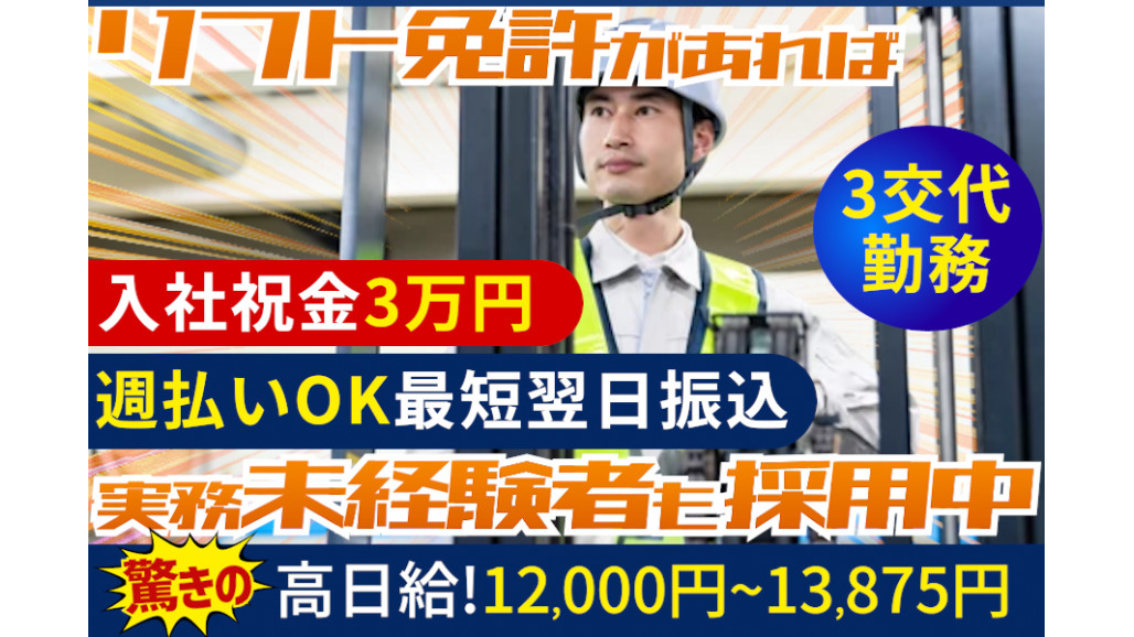 安心と納得の環境で働けるよう、手厚いサポートとフォロー体制を整えている当社。 今回、名古屋市守山区にあります常温倉庫にて未経験から始めるリフトスタッフ(有資格者)を募集します! 【仕事の魅力ポイント!】  ̄ ̄V ̄ ̄ ̄ ̄ ̄ ̄ ̄ ̄ ̄ ✅リフトスキルも身に付く!充実のサポート ✅驚きの高日給!12,000円~13,875円 ✅月収27万円超も可能な好条件ワーク ■■具体的なお仕事内容■■ 常温倉庫でカウンターリフトを使用し、飲料の入出荷作業をお任せします。力作業はほとんどなく、男性も女性もそれぞれのペースで活躍できる環境です。 ・リフト作業 ・自動倉庫の取り回し ・トラックへの積み込みや荷降ろし 【残業について】 残業の有無は配属部署によって異なりますので、働きやすい環境を一緒に相談しながら決めていきましょう! 【倉庫情報】 環境:常温倉庫 取扱商品:飲料 リフト:長爪カウンターリフト、3.5tサイズ 【職場見学・1日体験も実施】 お気軽にご応募下さいね! ~~~~~~~~~~~~~~~~ \ドライバンクはココが違う!/ ~~~~~~~~~~~~~~~~ ①現場経験者だから気持ちが分かります! ⏩️実は、社長を含め全員が現場の経験者 働く現場の楽しさや厳しさを知っているからこそ、悩みごとや不安にはしっかりと寄り添うことをお約束します! ②人材育成に情熱を注ぐ、人を大切にする会社 ⏩️私たちはスタッフ一人ひとりを大切な仲間と考え、長期的なキャリア支援や研修、資格取得を全力でサポートします。 ③どんな悩みもまずはご相談ください! ⏩️私たちは一人ひとりに向き合う会社です。 面接の緊張や職場への不安など、どんな小さな悩みでもお気軽に。あなたに寄り添い、最適なサポートをお約束します。 ④有休取得率90%超!プライベートも充実! ⏩️既にお休みの日を有休に切り替えることも可能。お子さんのイベントや旅行など、大切な時間をしっかり確保できます! 【求人ID-ASR01】 |