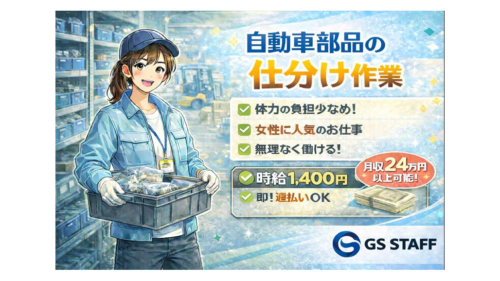 自動車部品のピッキング作業のお仕事です。 ~GS STAFFは、物流業界で働くあなたを応援します!~ ✅即!週払いOK! 入社して1週間の勤務から申請OK! 最短で翌日に振り込まれます。 ■■■おすすめポイント■■■ ★時給1,400円・月収24万円以上可能 ★自動車部品のピッキング作業 ★自動車部品関係なので長期休暇あり ■■■お仕事内容■■■ 自動車部品の倉庫で自動車部品のピッキングをして頂くお仕事です。 出荷先ごとの出荷指示に沿って、ロケーションからピッキングを行って頂きます。 部品関係の経験がない方でも、しっかり教えてもらえるので、安心してください。 重たい荷物も少ないので、女性にも人気のお仕事です。 興味のある方のご応募をお待ちしています! 【職場見学・1日体験も実施】 入社する前に実際に働く現場をぜひ見学ください。 実際に勤務する場所を見て頂くことによって、安心してお仕事を開始できると思います。 ~~~~~~~~~~~~~~ GS STAFFはココが違う! ~~~~~~~~~~~~~~ ①現場経験者だからこそ、気持ちが分かります! ⏩️社長を含め全員が現場の経験者。 働く現場の楽しさや厳しさを知っているからこそ、悩みごとや不安にはしっかりと寄り添うことをお約束します! ②人材育成に情熱を注ぐ、人を大切にする派遣会社! ⏩️私たちはスタッフさんを大切な社員として考え、長期的な働き方や仕事のコツ、研修や資格取得まで、あらゆる面でフルサポートします。 ③あなたの悩み、聞かせてください! ⏩️私たちは一人ひとりに向き合う会社です。 「久しぶりの面接で緊張する」「職場に馴染めるか不安」など、どんなお悩みでもお気軽にご相談くださいね。 ④有休取得率 90%超え! ⏩️元々お休みの日を有休に切り替えることも可能です! お子さんのイベントや旅行など、プライベートも大切にしてくださいね♪ 【求人ID-MR001】 |