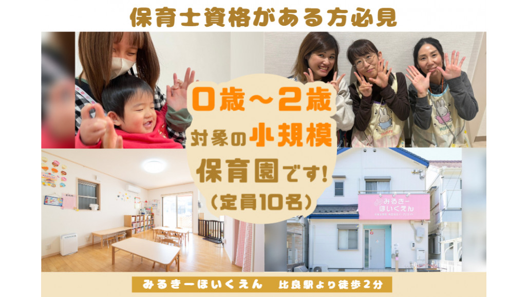 ✨✨残業・持ち帰り仕事もナシ!保育士さんの働きやすい環境を目指しています!✨✨ 企業主導型保育園「みるきーほいくえん」にて保育士パートさんを募集します! ブランクのある方や、未経験の方でも保育士資格があればOK。OJT研修があるので安心です! 【当園の特長】 ⭕当園の保育対象児は0~2歳ほど。定員は10名と少なめです。 子どもたち一人ひとりと、しっかり向き合える職場となっています。 ⭕働きやすい環境を目指します! 当園では残業がないだけでなく、持ち帰りの仕事もありません! 勤務時間は早番遅番と分かれているので、生活に合わせたシフトを組むことが可能です。 お仕事もプライベートも充実させませんか? あなたのライフスタイルに合わせて働くことができます。フルタイムでしっかり稼ぎたい方にも! ⭕駅チカで車通勤も可能 最寄駅から徒歩2分という好立地にあり通勤しやすい環境です!車通勤の場合には、無料駐車場をご用意しています。 【主な仕事内容】 ✅登園のお出迎え ✅保護者からの体調の確認 ✅遊び相手や遊びの見守り ✅お出かけ ✅食事やトイレ、おむつなどのお世話 ✅お昼寝の寝かしつけ ✅イベントの準備と運営 ✅園の書類作成・整理など ✅保護者対応 などなど!0~2歳さんを対象に、保育業務全般をお願いします。 ・~・~・~・~・~・ 体験入社 実施中! ・~・~・~・~・~・ 弊社では、希望に合わせて1~3日間の体験入社が可能です。 ✔ どんな仕事? ✔ どんな環境? ✔ どんな人達? 入社前の不安は体験入社で確認しましょう!ぜひお気軽に体験ください。 ✨イークリエイトグループ✨ 愛知県、三重県で体操教室を8店舗展開中 ①お子様がネイス体操教室に30%OFFで通える! ②6時間勤務、10分軽食休憩 (休憩中も給与あり) 【求人ID-MLK】 |