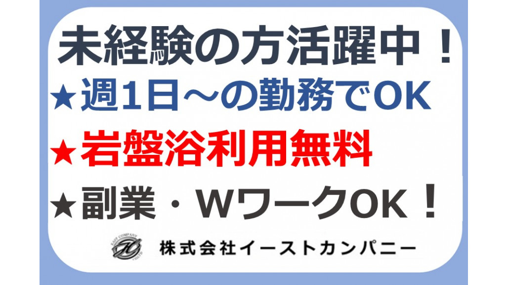 | 職種名 | 岩盤浴施設の清掃や受付 未経験の方積極採用中 岩盤浴利用無料 週1回から1日3時間~可 |