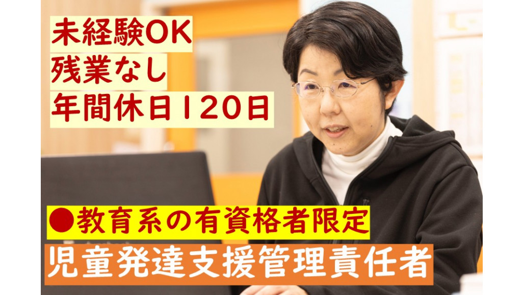 | 職種名 | 放課後等デイサービスの児童発達支援管理責任者 完全週休2日制 ブランク可 |