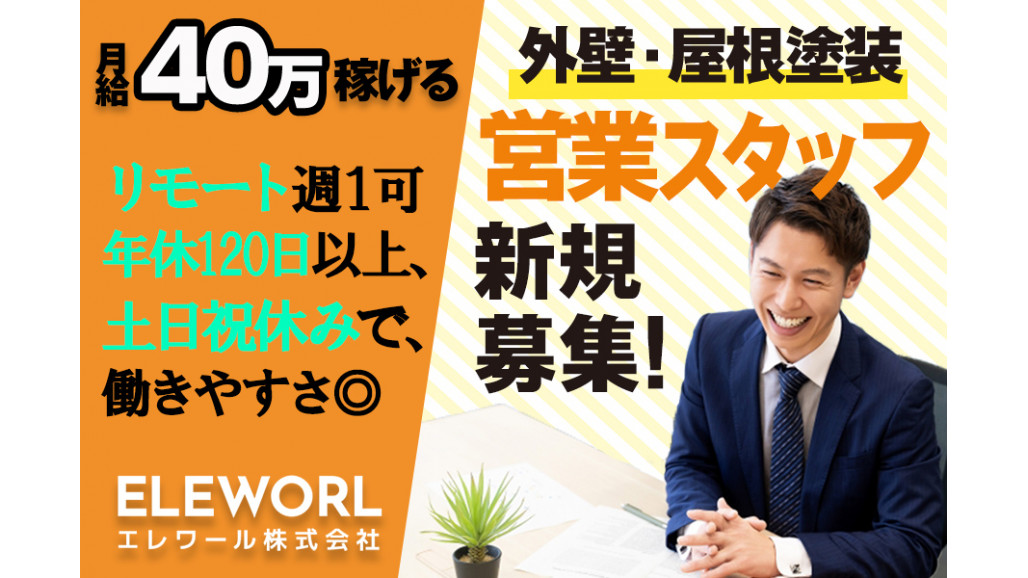 職種名 | 外壁改修工事の提案営業 土日祝休 賞与年2 週1リモート可 |