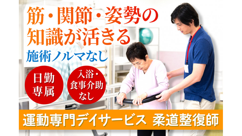 | 職種名 | 柔道整復師 運動専門デイサービス勤務 未経験可 ブランク可 週休二日 有給消化促進 |
