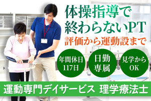 | 職種名 | 生活相談員 運動専門デイサービス勤務 未経験可 ブランク可 週休2日 有給消化促進 |