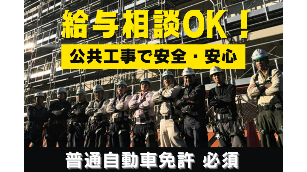 職種名 | 足場工事の現場作業員・未経験/完全週休2日(日祝+1日)/有給取得率100%/寮社宅あり |