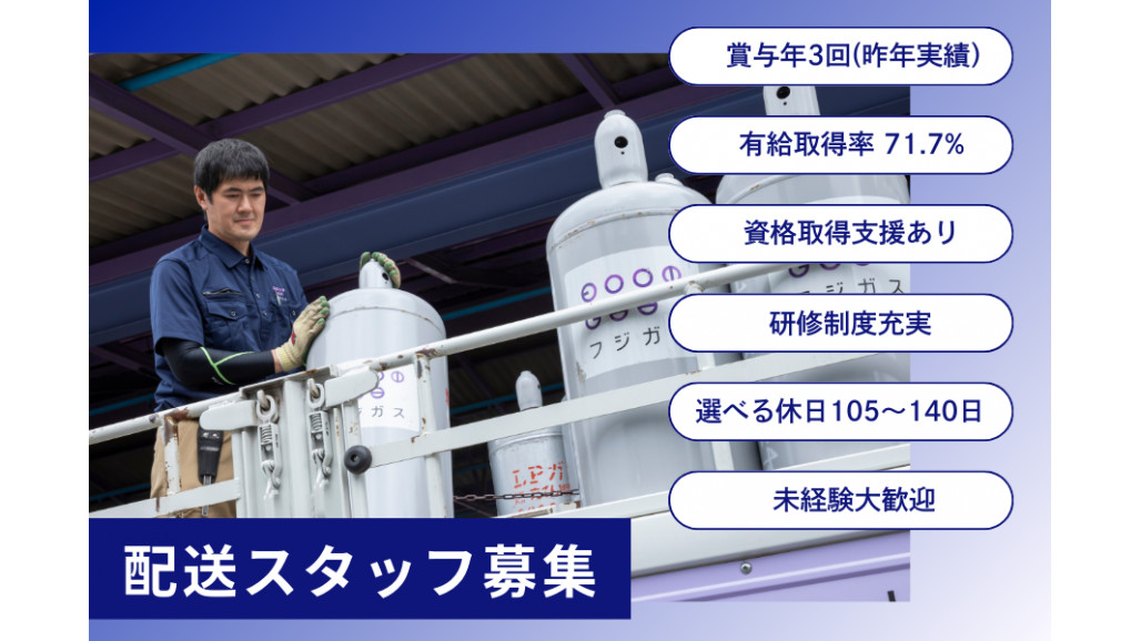 【おすすめポイント】 ✅年間休日105~140日!ライフスタイルに合わせて設定可 ✅生活を支える待遇・手当が充実! ✅残業少なめ! ✨妻子持ちの未経験から始めたスタッフも多数!✨ ・創業70年の景気に左右されない安定企業!安心して長く働けます。 ・選べる年間休日数!稼ぐ働き方、家族との時間を優先した働き方も可能。 【具体的な仕事内容】 地域密着で家庭や飲食店にガスを届けるルート配送。 日々決まったエリア、お客様への訪問のため 未経験でも1か月程度で余裕をもって勤められるようになります。 【詳しい仕事内容】 ・LPガスの配送/積み下ろし(基本リフトや台車を使用) ・前回配送したガス容器との交換作業 ・設備の目視点検 など 【入社後の研修について】 先輩同乗のもと業務を覚えていただきます。 身体に負担がかかりにくい積み下ろしのコツ・配送時の注意点 等 基礎から実践までしっかりと学び、成長できるようみんなで丁寧にサポートしますので ドライバーとしてお仕事した事が無い方もご安心ください。 【配送エリア】 ・世田谷区 ・稲城市 ・新宿区 ・渋谷区 ・練馬区の一部 ・大田区の一部 ※配送エリア固定/ルート固定/社用車使用 【とある1日の流れ】 ▼8:30 朝礼、業務確認・スケジュール確認のためのミーティングをおこないます ▼A.M. LPガスの積み込み、配送、設置、点検 ▼お昼休みは出先で取ります ▼P.M. 午後も配送と設置 ▼17:00~17:30 帰社後、1日の業務のまとめと翌日の準備をしたら退勤 =========== 当社が目指す姿 =========== フジガスは創業以来70年、地域のみなさまと共にLPガスおよびガス器具の販売に従事してきました。 LPガスに求められるものが大きく変化しつつある現在、まず私たち事業者がLPガスのポテンシャルをしっかりと認識し、 様々な人たちと手を結ぶことで、新しい時代に適したLPガス産業のあり方と可能性を模索していきます。 現在、全国100社以上のLPガス販売事業者と協業させていただいておりますが、この全国ネットワークを超えて、 2022年より「&LPGプロジェクト」をスタートしました。 この協業プラットフォームを活かし、未来に向けたイノベーションを生み出すことを目標としています。 【求人ID-DRV3】 |