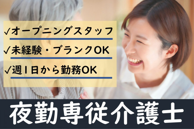 | 職種名 | 夜勤専従介護スタッフ オープニングスタッフ 週1日から可 |