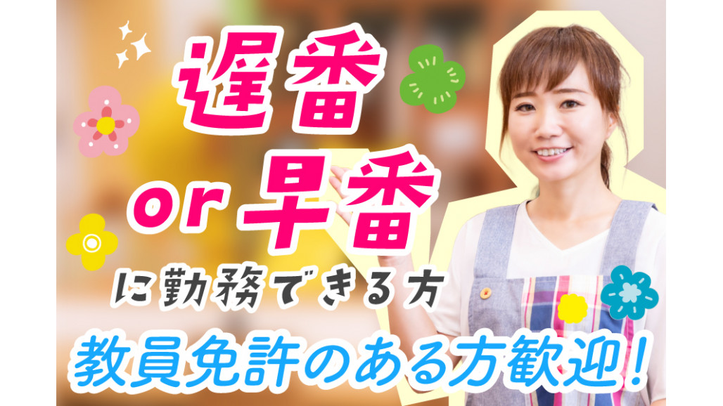 ⭐️遅番or早番の時間帯に働ける方募集中⭐️ 早番)7:00~13:00 遅番)14:00~20:00 ⭐️必須資格⭐️ 教員免許(小・中・高のいずれか)をお持ちの方 ⭐️具体的なお仕事内容⭐️ 保育園にて、先生のお仕事をお任せします。 主に正職員の担任の先生のサポート業務で、子どもたちの見守りや活動の補助、環境整備などを通じて、保育の現場を一緒に支えていただける方を募集しています。 ・こどもたちの生活指導、健康指導 ・お遊戯やお絵かき、工作などの指導 ・こどもたちの食事やお手洗いのサポート ・登園や降園の迎え入れ、見送り など 私たちと一緒に保育園で働きませんか? ⭐️働きやすい環境が整っています⭐️ ■週2回3時間からOK! ■残業や時間外勤務など一切なし! ■給食費補助あり◎健康的でおいしいごはん✨ ⭐ひまわりほいくえんの魅力⭐ ✅給食費補助について ■1食480円でおいしく健康ごはん✨ ■月額上限3,000円で超過分は園負担 ■食事休憩中も勤務時間としてカウントします ✅急なお休みにも対応できます◎ 当園では、必要な人員よりも多くパートさんが在籍し、急なお休みにも対応できる体制づくりをしています。家族やご自身の急病など、急に休んで迷惑をかけてしまうのでは...とそんな心配は無用です! 若い方からベテランの方まで風通しがよく、助け合いのできる職場なので、長く続ける方が多い職場です。 まずは見学のみもOK!ぜひご応募くださいね✨ 【求人ID-NRS】 |